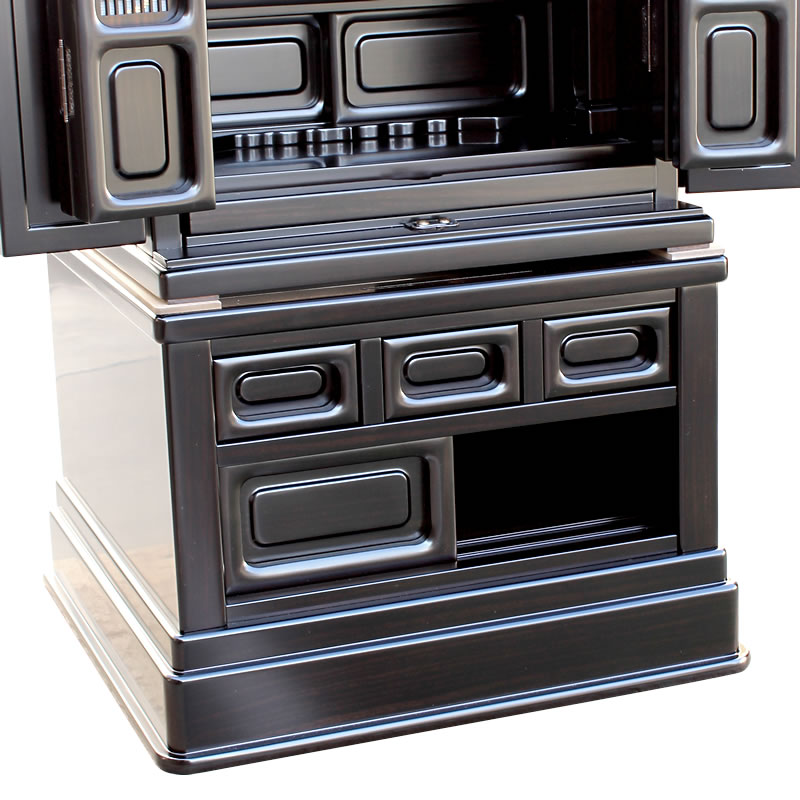 障子付き内扉や、彫り欄間、下台の引き出しなど高機能が揃っていながらも、当店冠名を付けるほどスタッフ絶賛のため非常にお求めやすいお値段となっております。