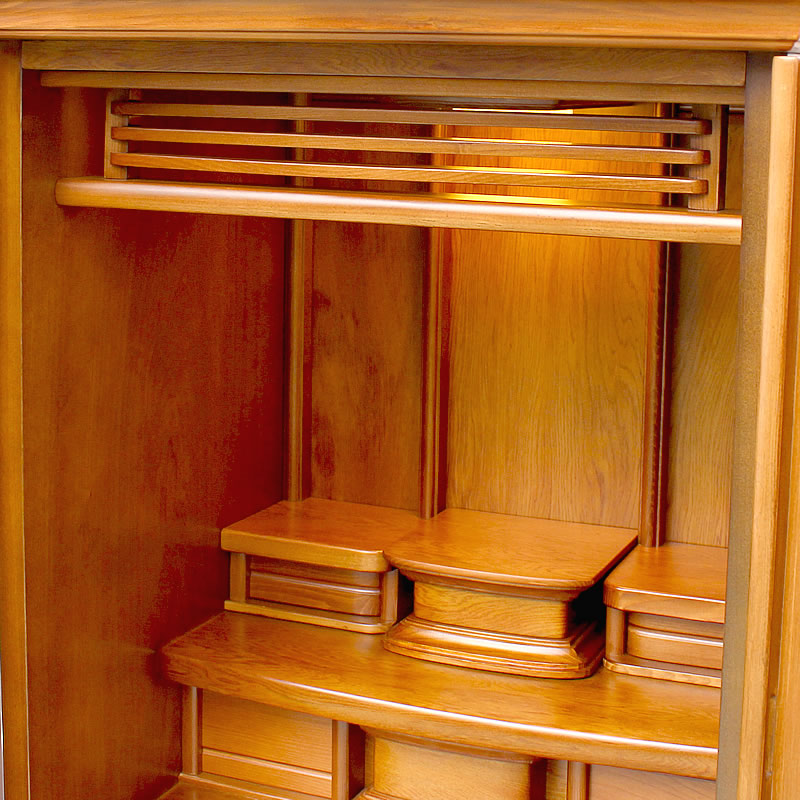 本尊台は取り外しが可能になりますので、大きめの御本尊を既にお持ちの方でも合わせていただきやすくなっており、下台も高さがある収納スペースとなっているため、様々な仏具や小型の骨壺なども収納いただけます。