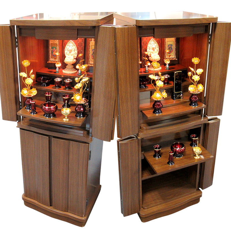 ウォールナット色のお仏壇に実際に仏具を並べた斜めからの写真