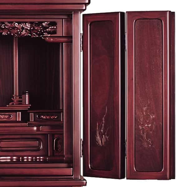 お仏壇の特徴として、扉の裏に丁寧な彫り物があり、高級感を漂わせています。